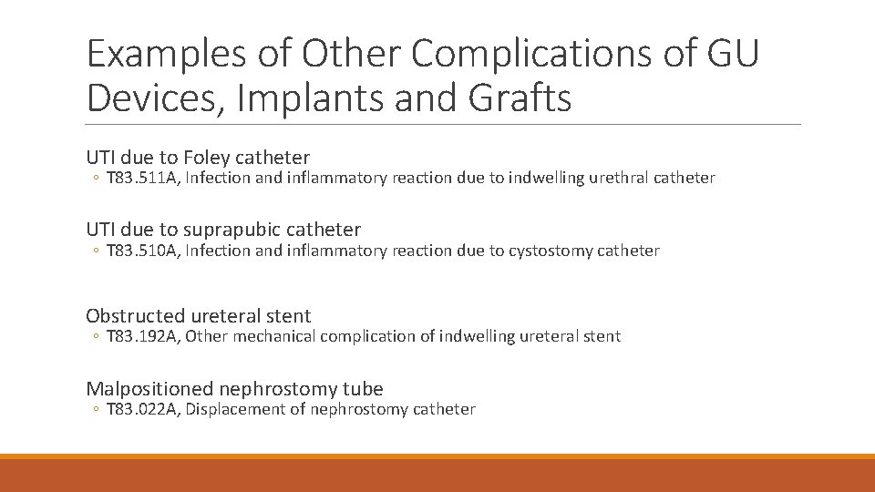 Examples of Other Complications of GU Devices, Implants and Grafts UTI due to Foley catheter ◦ T 83. 511 A, Infection and inflammatory reaction due to indwelling urethral catheter UTI due to suprapubic catheter ◦ T 83. 510 A, Infection and inflammatory reaction due to cystostomy catheter Obstructed ureteral stent ◦ T 83. 192 A, Other mechanical complication of indwelling ureteral stent Malpositioned nephrostomy tube ◦ T 83. 022 A, Displacement of nephrostomy catheter