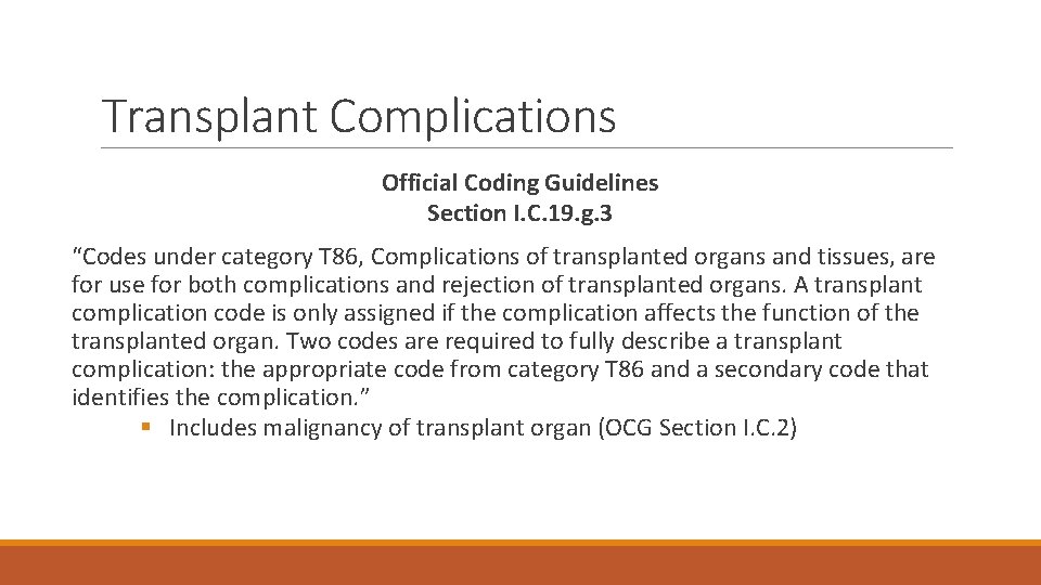Transplant Complications Official Coding Guidelines Section I. C. 19. g. 3 “Codes under category T 86, Complications of transplanted organs and tissues, are for use for both complications and rejection of transplanted organs. A transplant complication code is only assigned if the complication affects the function of the transplanted organ. Two codes are required to fully describe a transplant complication: the appropriate code from category T 86 and a secondary code that identifies the complication. ” § Includes malignancy of transplant organ (OCG Section I. C. 2)