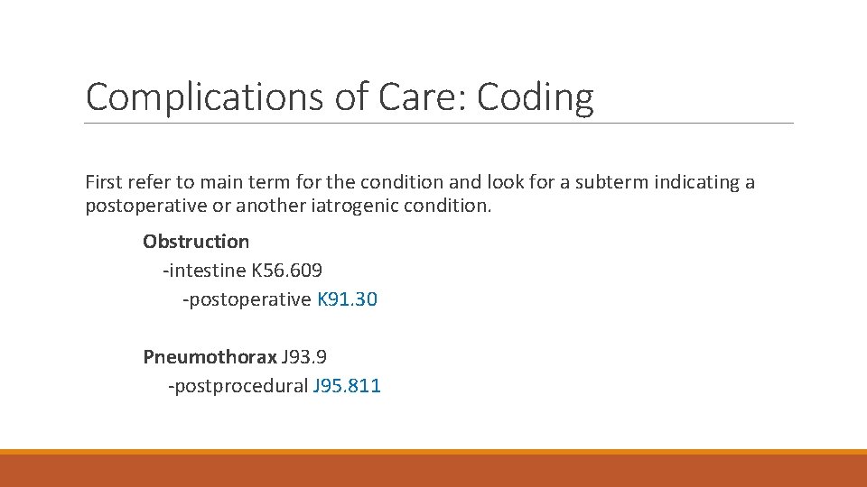 Complications of Care: Coding First refer to main term for the condition and look for a subterm indicating a postoperative or another iatrogenic condition. Obstruction -intestine K 56. 609 -postoperative K 91. 30 Pneumothorax J 93. 9 -postprocedural J 95. 811