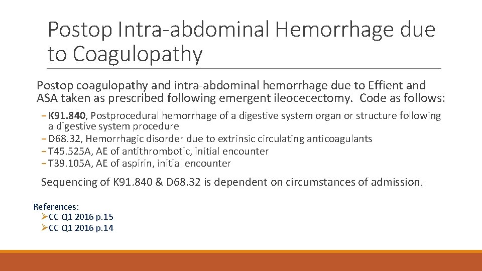 Postop Intra-abdominal Hemorrhage due to Coagulopathy Postop coagulopathy and intra-abdominal hemorrhage due to Effient and ASA taken as prescribed following emergent ileocecectomy. Code as follows: − K 91. 840, Postprocedural hemorrhage of a digestive system organ or structure following a digestive system procedure − D 68. 32, Hemorrhagic disorder due to extrinsic circulating anticoagulants − T 45. 525 A, AE of antithrombotic, initial encounter − T 39. 105 A, AE of aspirin, initial encounter Sequencing of K 91. 840 & D 68. 32 is dependent on circumstances of admission. References: ØCC Q 1 2016 p. 15 ØCC Q 1 2016 p. 14