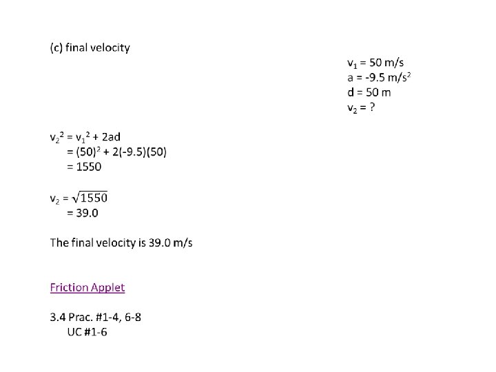 Example A car skids on wet concrete (µk = 0. 97) for 50 m. The mass of the car is 2000 kg and the initial velocity is 50 m/s. Calculate: a) the kinetic friction b) the acceleration (deceleration) c) the final velocity (a) Find the normal force FN = mg = (2000)(9. 81) = 19 620 N Use the coefficient of kinetic friction Fk = uk. FN = (0. 97)(19 620) = 19 031 N The kinetic friction is 19 031 N. m = 2000 kg g = 9. 81 m/s 2 FN = ? µ k = 0. 97 FN = 19620 Fk = ?