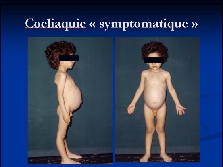 Symptômes évidents n Général n 6 et 24 mois n pâle n triste, grognon, fatigué n fesses tombantes « tristes » n altérations des phanères n Digestif n diarrhées abondantes fétides n vomissements n flatulences n amaigrissement n ballonnement abdominal
