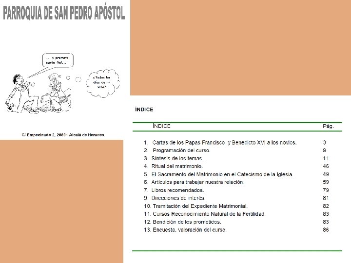 6º Familia, comunidad de vida y amor. Paternidad responsable y educación de los hijos. 7º ¿Para siempre? La decisión de amar. 8º El encuentro con Cristo nos cambia la vida. Celebraciones: § Bendición de novios § Entrega del Evangelio. § Celebración del Perdón. § Eucaristía. José María Viñas