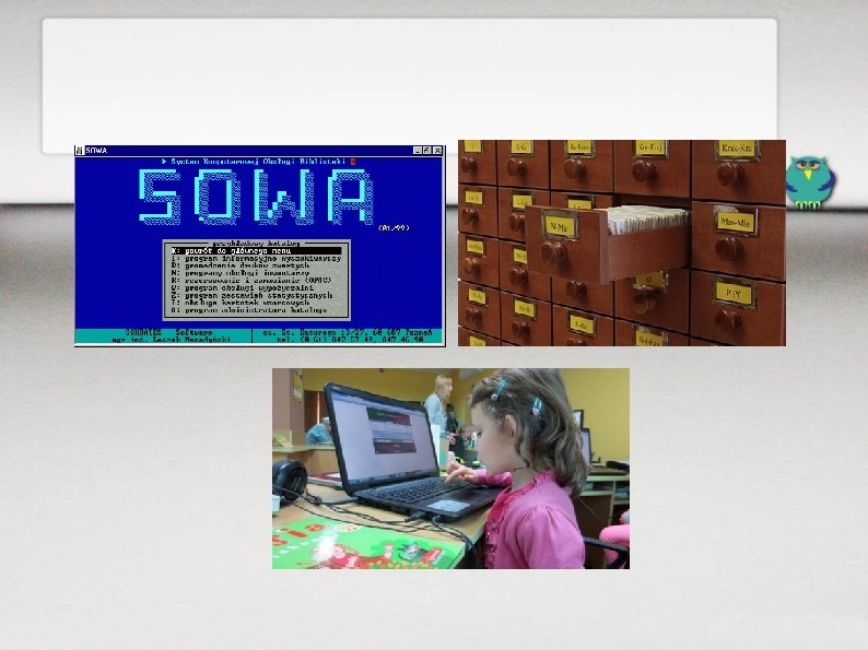 Miejska Biblioteka w Olsztynie (porównanie) w 2014 roku 330 tys. egzemplarzy 190 tys. logowań do katalogu 250 tys. odwiedzin katalogu 80 tys. prolongat on-line 60 tys. zamówień i rezerwacji 36 tys. zarejestrowanych czytelników 2, 4 tys. książek wypożyczanych dziennie Ponad 100 tys. wypożyczeń i prolongat on-line (01 i 02 2015 r. ) co 10 sek. wypożyczana książkę co 1, 9 min. logowanie do katalogu WWW Dane z systemu Sowa. SQL