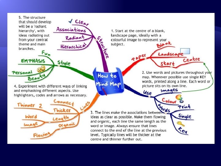 Why do we do mind maps? This is how we organize our memories � How information in long-term memory organized? � 1. Hierarchies-systems in which concepts are arranged from more general to more specific. � 2. Semantic Networks-more irregular and distorted systems with multiple links from one concept to another. EG. Bird linked to flying. . feathers. . wings � 3. Schemas- are preexisting mental frameworks � 4. Connectionist networks- memory is stored throughout the brain through neurons.