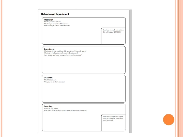 BEHAVIOURAL EXPERIMENT Use an experiment form Create a 0 hypotheses (Automatic Thought) Create an alternative hypotheses (Alternative Thought) Score the reliability of these thoughts both before and after the experiment