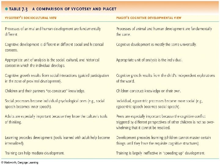 Vygotsky’s Theory of Cognitive Development • Saw cognitive development as an apprenticeship in which children advance by interaction with others more mature. • Zone of Proximal Development Child’s Own knowledge • Private Speech Scaffolding What child can do after