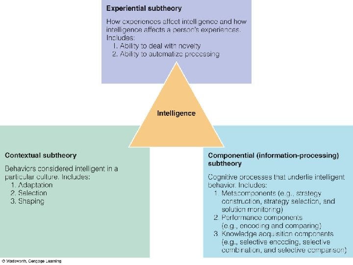 Sternberg’s Triarchic Theory of Intelligence • Componential Intelligence – information processing (analytical) • Experiential Intelligence – Problem solving and creativity • Divergent thinking • Convergent thinking • Contextual Intelligence – “street smarts” – ability to adapt