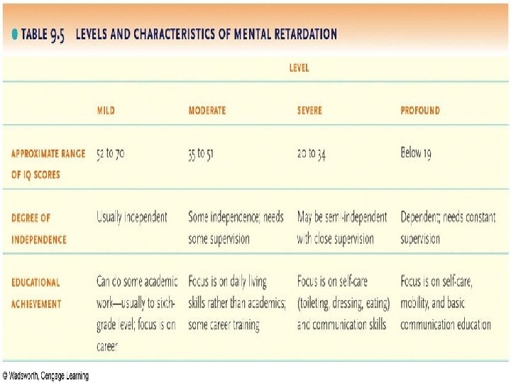 Extremes of Intelligence • Mental Retardation – Significantly below average intellectual functioning with limitations in areas of adaptive behavior such as self-care and social skills – Must occur before age 18 to be diagnosed – 4 levels • • Mild (50 – 70) 85% Moderate ( 35 – 49) 10% Severe (20 – 34) 4% Profound ( 19 and below) 1%
