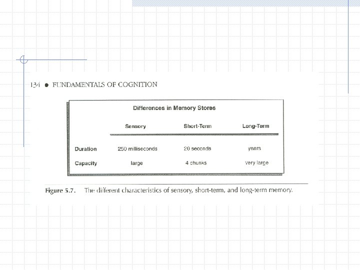 Differences Among 3 Memory Stores Capacity—only short-term memory is severely limited in capacity, namely, to 4 chunks. Duration—differences are an order of magnitude or more among sensory (250 ms), short-term (20 s), and long-term (20 years or more).