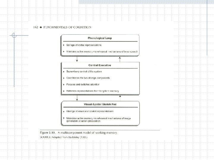 Models of Working Memory Baddeley proposed a phonological loop and a visual-spatial sketch pad coordinated by a central executive. The loop stores and rehearses verbal representations whereas the sketch pad does the same for visual/spatial representations. Central executive focuses and switches attention, supervises and coordinates the storage components, and retrieves representations from long-term memory.