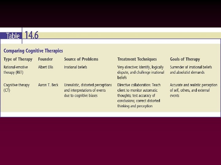 Cognitive Behavioral Therapy • An integrated therapy that combines cognitive therapy (changing self-defeating thinking) with behavior therapy (changing inappropriate behaviors) • Based on the assumption that cognitions, behaviors, and emotional responses are interrelated • Cognitive-behavioral therapists challenge maladaptive beliefs and substitute more adaptive cognitions • They use behavior modification, shaping, reinforcement, and modeling to teach problem solving and change unhealthy behavior patterns • Effective for treatment of anxiety, depression & anorexia nervosa