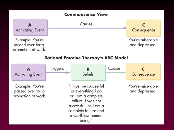 How REBT Works • Step 1: Identify the core irrational beliefs or self talk that underlie personal distress • Step 2: Vigorously dispute and challenge the irrational beliefs. Therapist acts as a teacher to show patient how to do this. – Stop Irrational Thoughts – Reframe them to be more positive – Dispute irrational beliefs with evidence • Rational-emotive therapists tend to be very direct and even confrontational • From the client’s perspective, rational-emotive therapy requires considerable effort – person must admit her irrational beliefs and accept the fact that those beliefs are irrational and unhealthy – client must radically change her way of interpreting and responding to stressful events