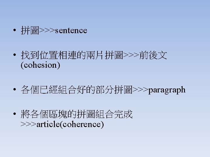 • blue, calm and relaxed, looking up • Cohesion (No) Coherence(Yes) • 理解困難