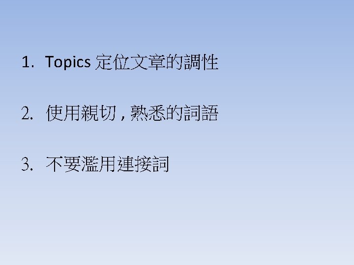 這章節你至少要知道的事情 • Old before New • Make your topics short and reasonably consistent