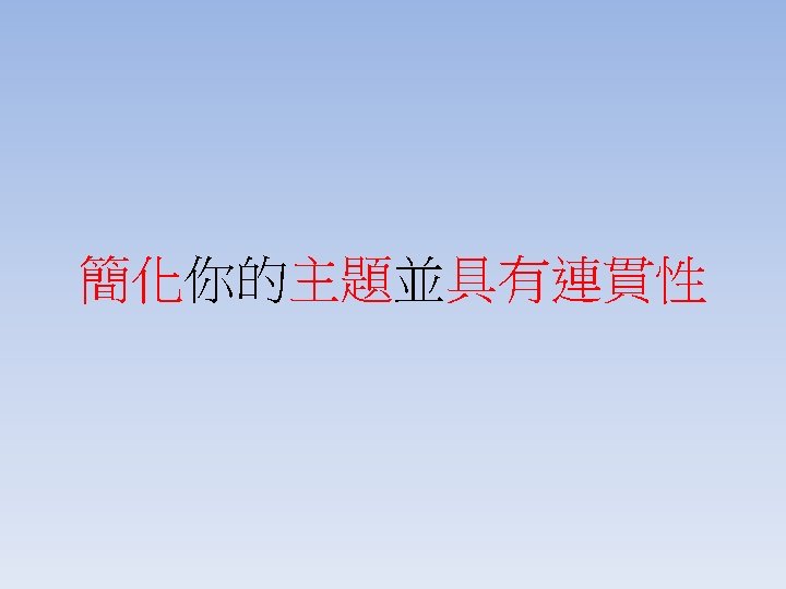 Cohesion(字句連貫) Coherence(語意連貫) 主題一致 (unity) • 連接詞(conjunction) • • 指標詞(signposts and linking words) • 承先啟後 (logical order and transitions)