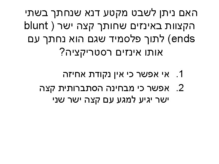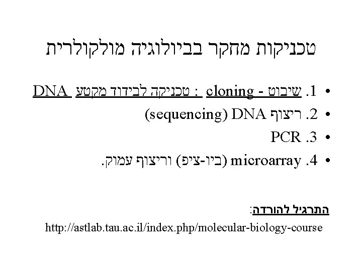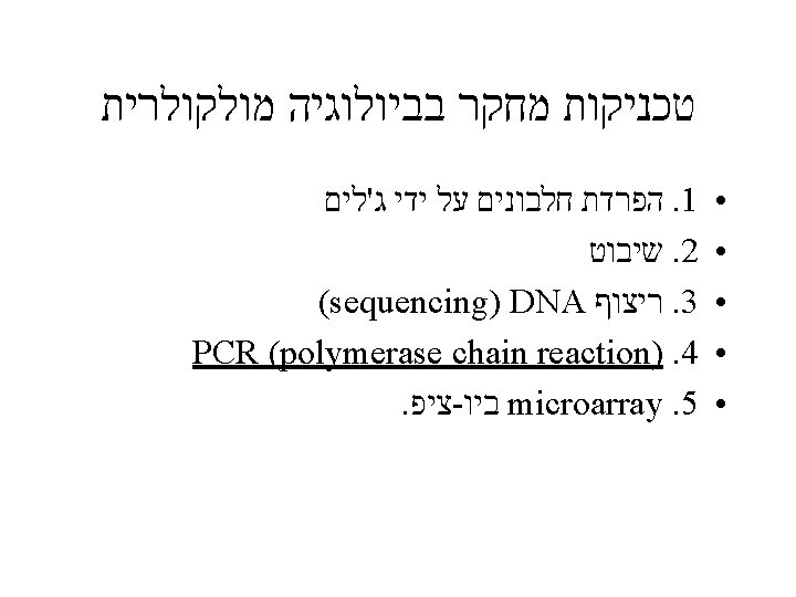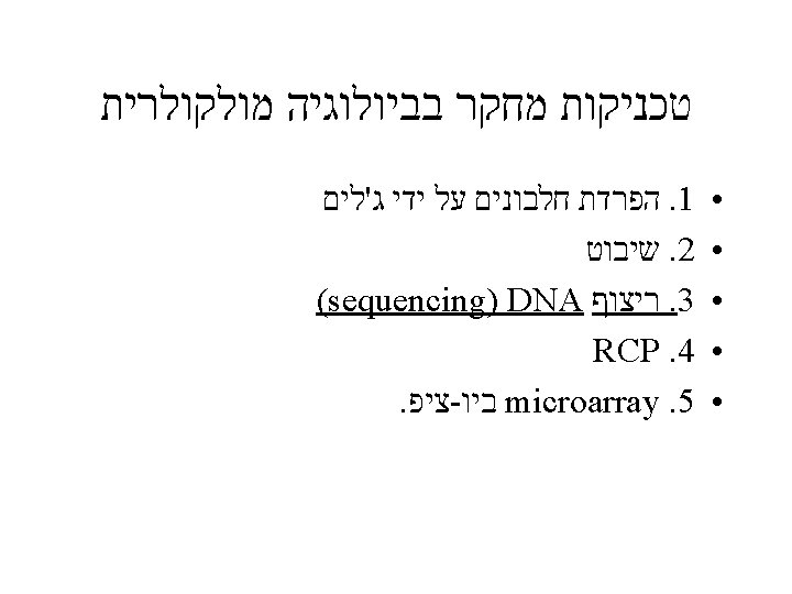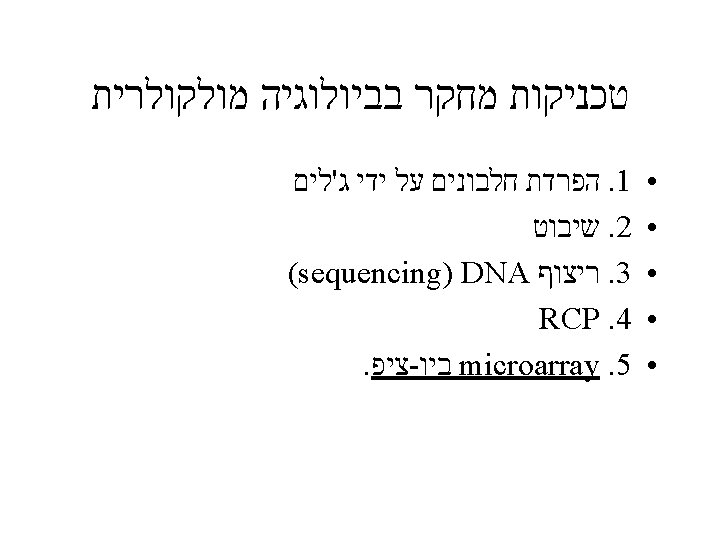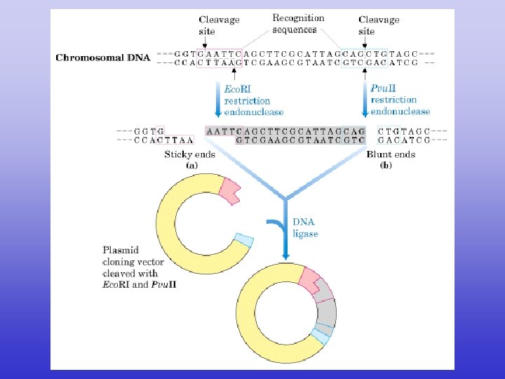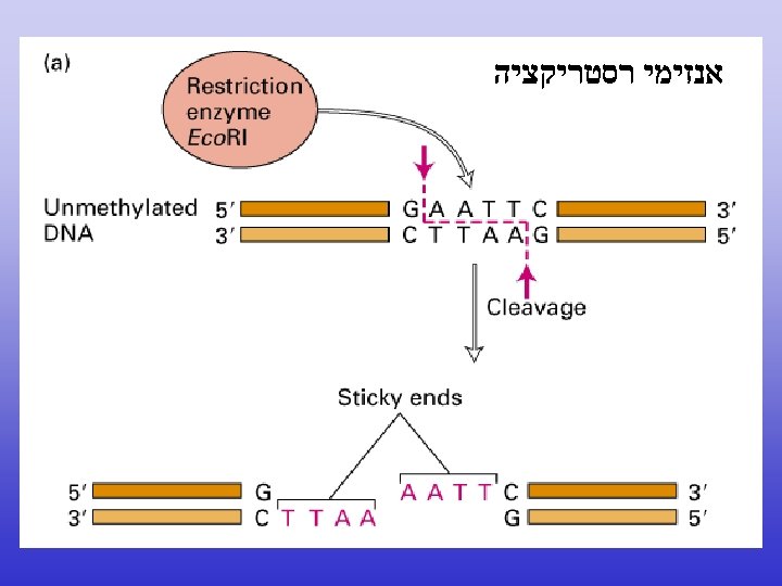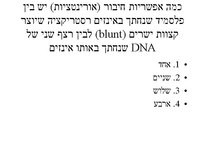אתרי חיתוך של שלושה אינזימי רסטריקציה : 3 תמונה Products generated by restriction enzymes Cohesive ends Eco. RI Bam. HI 5’ GAATTC 3’ 3’ CTTAAG 5’ 5’ GGATCC 3’ 3’ CCTAGG 5’ Xho. I 5’ CTCGAG 3’ 3’ GAGCTC 5” 5’ G AATTC 3’ 3’ CTTAA G 5’ 5’ G GATCC 3’ 3’ CCTAG G 5’ 5’ CTCGA 3’ G G 3’ AGCTC 5’