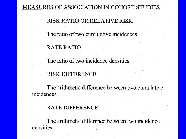 STUDY BASE IN COHORT STUDIES • The study base is the person-time experience of the individuals in whom the outcome is ascertained. • Study base should be the same for exposed and unexposed in cohort studies. Thus the denominator for calculation of incidence rates must be the same number of people for the same period of observation. • Calculation of person-years at risk is the means of achieving equivalence of study base in cohort studies.