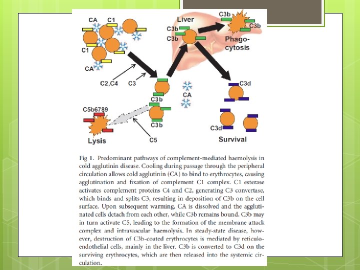 CAD, hemolysis Once Ig. M binds to RBC, complement activation occurs C 3 b binds to cell surface in periphery RBC travels to body core Ig. M dissociates Can lead to extravascular or intravascular hemolysis Can be polyclonal or monoclonal Polyclonal – postinfectious (Mycoplasma, EBV, legionella) Monoclonal – underlying lymphoproliferative d/o (clonal light chain predominance in 90%, trisomies 3, 12 and t(8: 22); )