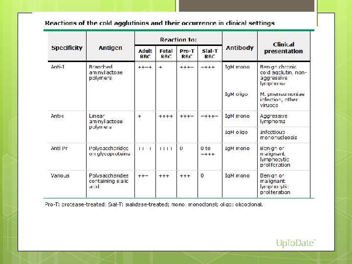 Diagnosis Signs/symptoms of hemolysis DAT: +C 3 d, - Ig. G (classically) Both C 3 d and Ig. G in ~20% Titer and thermal activity >512 is clinically significant, but hemolysis can occur in lower titers