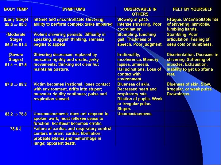 Hypothermia l Initial Symptoms shivering dizzy, drowsy withdrawn behavior irritability confusion slowed, slurred speech – altered vision – stumbling – – – l The “umbles”-stumbles, mumbles, fumbles, and grumbles Severe Stages – stops shivering – desire to lie down and sleep – heartbeat and breathing is faint or undetectable – unconsciousness followed by DEATH