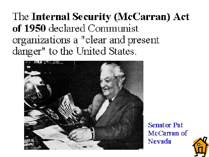 • Red Scare was Americans response to the fear of Communism • Senator Joseph Mc. Carthy accused 205 US Govt. officials of being Communist. • Mc. Carthyism to destroy or assassinate one’s character without proof and it ruined the careers of many Americans. Became a witch hunt that led to Americans pledging a “loyalty oath” oath to the United States…….