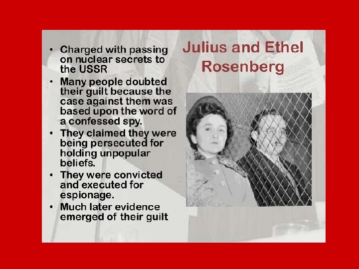 • Loyalty Programs, Committee investigations, Blacklists and highly publicized spy cases convinced many Americans that the threat of spies was very real and lead to a climate of great suspicion in America. Many people’s civil rights were violated during this period. • http: //www. youtube. com/watch? v=Sk. Yl_AH-qyk