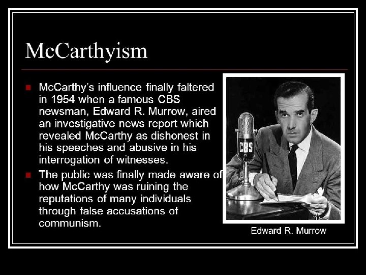 – Mc. Carthy is exposed as a fraud and loses all credibility, and the Senate condemns him. • Mc. Carthy accuses the Senate of being Communists