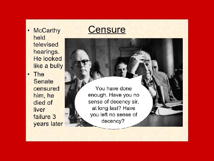• Many Senators were afraid to stand up to him for fear of being branded a “pinko” (communist sympathizer)