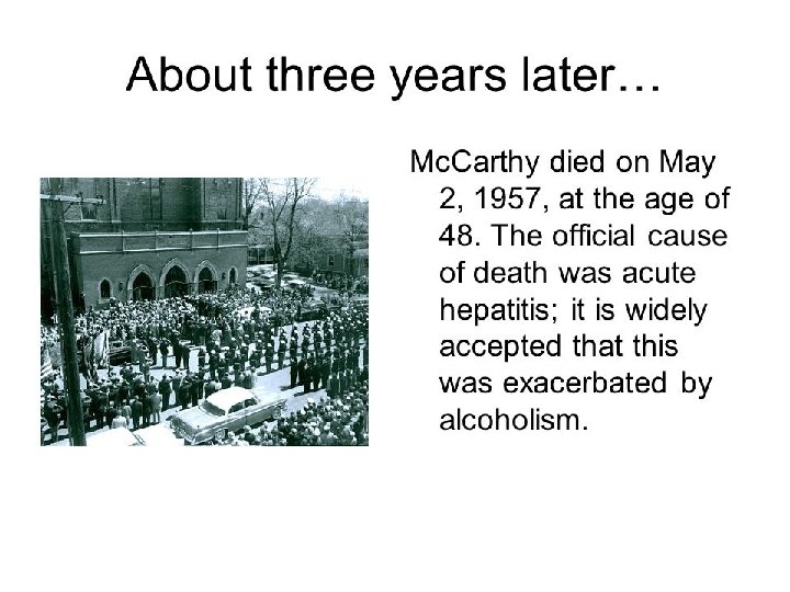 1950 - Mc. Carthy’s List • 205 known Communists working for the US government – Actually people who had been investigated under Truman’s Loyalty Programs • Used this list to catapult himself to fame (he was a nobody rookie senator before this)