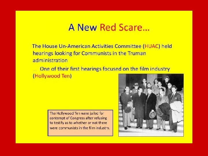 HUAC • HUAC: began to probe the U. S. (Especially Hollywood) for Communist influences. • The Hollywood Ten: a group of writers, directors, and producers who refused to testify before the HUAC. All were fined or jailed up to a year.