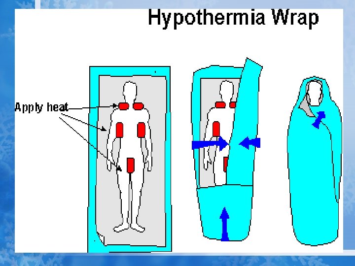 TREATMENT Moderate hypothermia • Get the patient as sheltered as possible (tent, snow cave, etc. ) • Remove wet clothing and replace with dry clothing. Keep patient laying down. Place patient in a sleeping bag with a second rescuer of normal body temperature. Direct skin to skin contact is preferable.