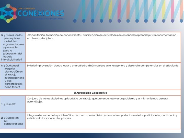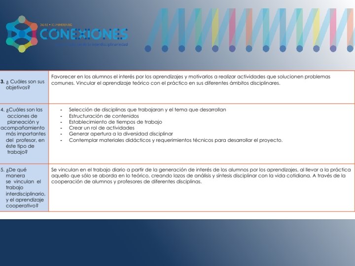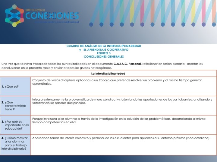 Reflexión sobre interdisciplinariedad: - La interdisciplinariedad es considerada por muchos especialistas como una forma de pensar y de proceder, a fin de lograr cambios en la forma de ver el mundo en la actualidad, y así lograr que nuestros alumnos también lo vean de esta manera. Si los alumnos no piensan de una forma interdisciplinaria, el cambio en la forma de pensar coherentemente va a tornarse mucho más difícil. En aras de lograr este cambio en la forma de pensar y hacer, tiene que existir un diseño curricular que refleje esa interdisciplinariedad; de este modo, deben elaborarse programas que reflejen una determinada forma de agrupar contenidos para las diferentes asignaturas. - La interdisciplinariedad aplicando las técnicas etnográficas a una serie de experiencias vividas por el autor en diversos encuentros de la Antropología Cultural con otros campos disciplinares. Tras definir las condiciones mínimas de comunicación para que la interdisciplinariedad sea posible y definir el concepto, se ahonda en las condiciones sociales de su realización. - Lo interdisciplinario, puede ser definido básicamente como: La transferencia de métodos de una disciplina a otra. También desborda las disciplinas, pero su meta todavía permanece dentro del marco de investigación disciplinaria. En la interdisciplinariedad, varias disciplinas con un objetivo en común son reunidas y puestas a cooperar”