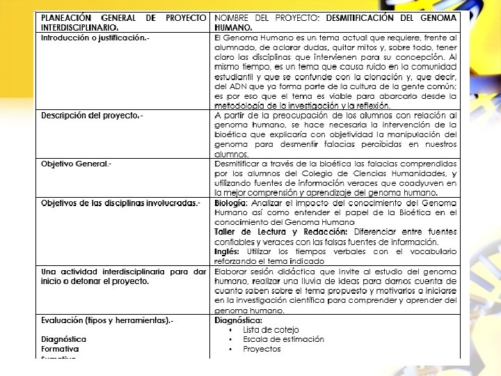 REFLEXIÓN INTERDISCIPLINARIA DEL PROYECTO • Lo que se pretende es desmitificar, a través de la Bioética, las falacias comprendidas por los alumnos del Colegio de Ciencias Humanidades sobre el Proyecto del Genoma Humano, utilizando fuentes de información veraces que coadyuven en la mejor comprensión y aprendizaje del mismo. • Pensamos que utilizando las estrategias adecuadas, los alumnos del Colegio de Ciencias Humanidades tendrán una mejor comprensión del tema así como tener un criterio propio que le llevará a una mejor toma de decisiones.