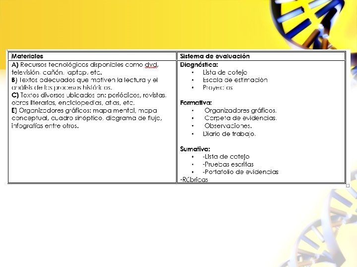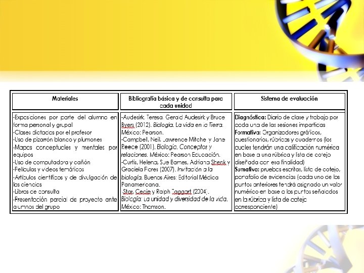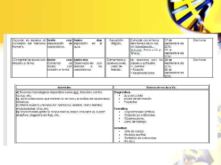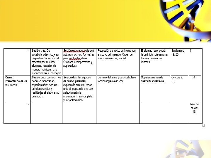 DISCIPLINAS INVOLUCRADAS Y OBJETIVOS ESPECÍFICOS • BIOLOGÍA: - Analizar el impacto del conocimiento del Genoma Humano. - Comprender el papel de la Bioética en el conocimiento de éste. • TLRIID: - Diferenciar entre fuentes confiables y veraces con las falsas fuentes. - Estructurar ideas correctamente. - Tener precisión y coherencia en la redacción e investigación. • INGLÉS: - Utilizar los tiempos verbales con el vocabulario reforzando el tema indicado.