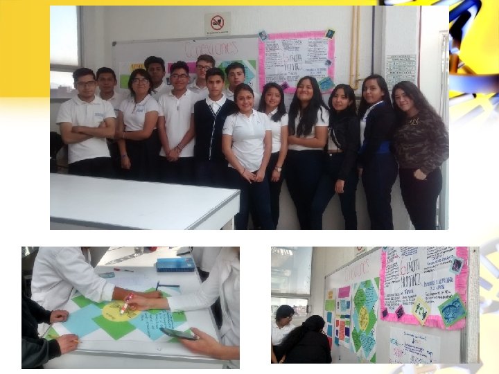 Avances Tropiezos Soluciones 6. Organización en tiempo, así como disponibilidad de cada uno de los docentes. 7. Se logró el diálogo entre los docentes, así como la asignación de tareas específicas a cada uno de los miembros del proyecto. 8. Interés de los profesores de las asignaturas en otros campos, así como el reconocimiento de la importancia de un proyecto interdisciplinario que vaya más allá del terreno de conocimiento del profesor. 9. Disposición de los alumnos e interés por aprender del docente. 6. Sobrecarga de trabajo debido al cierre de curso. 7. Los profesores han dispuesto de su tiempo personal o de otras clases para reuniones emergentes. 8. Una sólo materia como eje central del programa, mientras que el resto pareciera de carácter secundario. 9. Debido al poco tiempo para la realización de las actividades, si un alumno no acudía a las clases, el avance no era el mismo con respecto al de otros compañeros. 6. Reuniones breves y concisas. 7. Buscamos que cada una de las actividades enfatizará la importancia de cada materia en el desarrollo del proyecto. 8. Se buscó que los alumnos se mantuvieran al corriente en cuanto a entrega de proyectos, desarrollo y propósitos del mismo.
