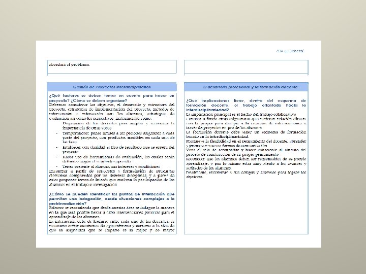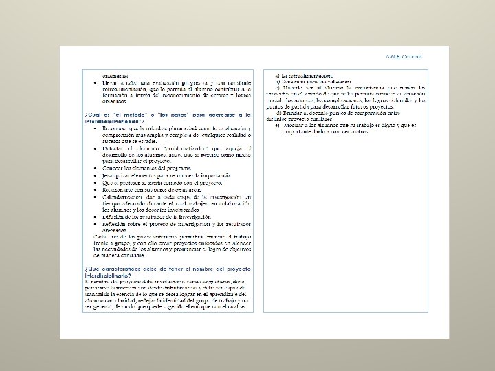 5. ¿Cuáles son los prerrequisitos materiales, organizacionales y personales para la planeación del trabajo interdisciplinario? - - 6. ¿Qué papel juega la planeación en el trabajo interdisciplinario y qué características debe tener? Deben existir reuniones y comunicación entre los maestros de diferentes áreas para establecer criterios compartidos para trabajar un tema concreto y también para propiciar un lenguaje común. Los maestros deben contar con preparación y herramientas adecuadas para el trabajo. El contenido temático de las asignaturas incluya conocimientos en que pueda aplicarse la interdisciplinariedad. Los alumnos también pueden proponer algún(os) temas de su interés para investigar, y desde que diferentes disciplinas les interesa abordarlos La planeación de este trabajo debe hacerse con anticipación, a fin de que tanto los maestros como los alumnos puedan prepararse para afrontarlos. No debe ser la simple suma de dos disciplinas que tratan o desarrollan un mismo tema, sino el buscar puntos de intersección entre ambas. Mostrar a los alumnos que las conclusiones siempre serán más ricas y completas en la interdisciplinariedad que si se toman de especialistas separados