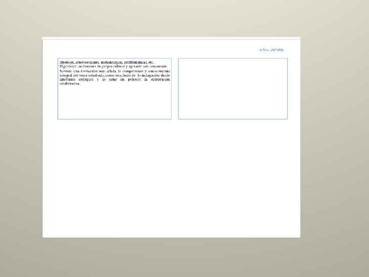 Reflexión: Graciela E Giorguli Chávez Materia: O. Educativa IV Contestando la pregunta, de cuáles fueron las tres dificultades principales para la construcción y desarrollo del “Proyecto interdisciplinario”, puedo decir que fueron: Buscar tiempo común con las otras maestras para ponernos de acuerdo, pues nuestros horarios son diferentes. No conocer los programas y contenidos de las otras asignaturas, Biología e Inglés Entender, y comentar en equipo la diferencia entre interdisciplinariedad y multidisciplinariedad para poder integrar áreas distintas en un mismo proyecto. Reafirmar, que puntos de vista distintos pueden sumar a la eficacia del proyecto.