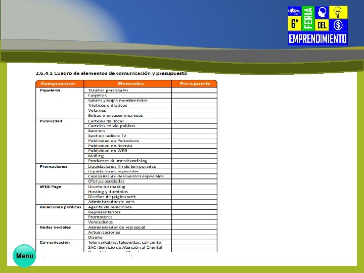 MARKETING El Plan de Marketing es necesario realizar una serie de pasos que serán detallados a continuación. Estos pasos son: • Descripción de los productos/servicios: La definición de los productos/servicios no debe quedarse en una mera enumeración, sino que es conveniente que se detallen las características comerciales y técnicas de los mismos; especificar calidades, tamaños, composición, marcas, etc. • Estudio del mercado: estudio del cliente, de la competencia, de las empresas proveedoras, determinación del precio de venta, el margen bruto unitario. Localización de la empresa. • Comunicación. La última etapa del Plan de Marketing es la determinación de las acciones de comunicación que la empresa plantea para dar a conocer sus productos/servicios. • Publicidad. Dentro de este apartado nos encontramos con diversos medios publicitarios como son: Prensa, páginas web, televisión, radio, promoción, Merchandising PASOS