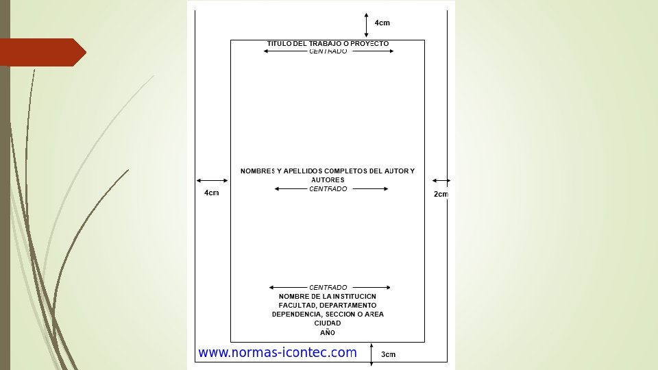 MÁRGENES Margen Superior: Para portada o títulos 4 centímetros y para hojas contenido regular 3 centímetros. Margen Inferior: Sin importar el contenido será de 3 centímetros.