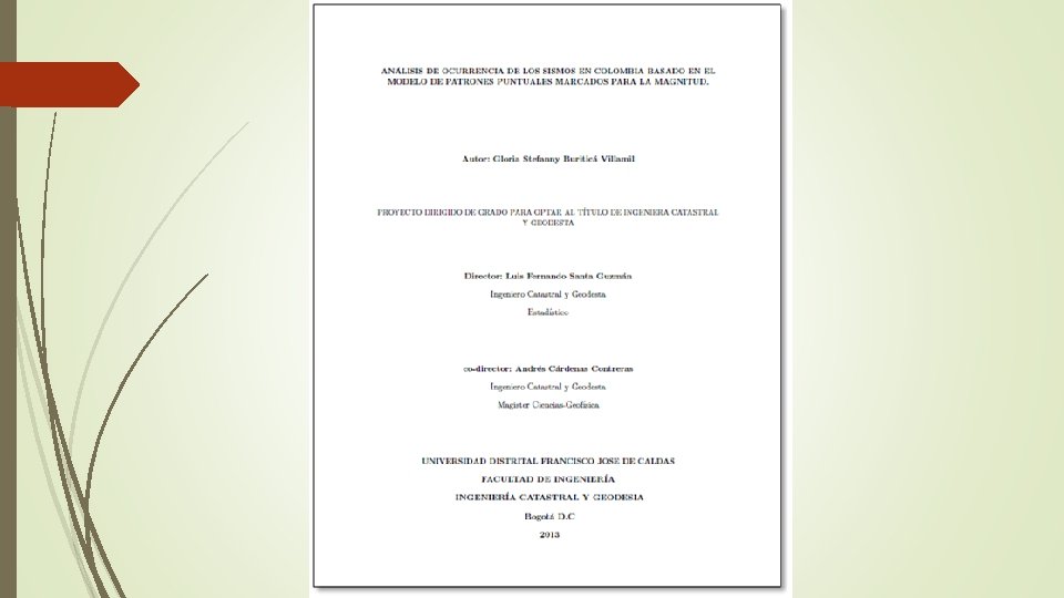 PORTADA La portada es la primera hoja del trabajo; contiene la información del título y tipo de documento desarrollado, ejemplo: Tesis, ensayo, informe, etc. En esta sección se mencionan los nombres de las personas participantes en la construcción del documento, si hubiese directores o profesores que ejercieron una tutoría sobre el mismo, se ubican en forma de bloque equidistando de los autores y la institución frente a la cual se presenta el mismo, ciudad y fecha.