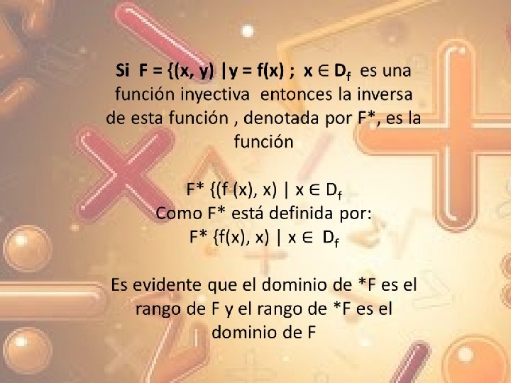 Con dominios Df y Dg respectivamente, a) F +G = { (x, y) |y = f(x) + g(x) } entonces las funciones F + G, F – G FG y F/G, son funciones con dominio b) F - G = { (x, y) |y = f(x) – g(x) } Df ∩ Dg, definidas por d) F/G = {(x, y) | y = f(x)/g(x), donde g(x) ≠ 0 } c) F G = {(x, y) | y = f(x) g(x) }