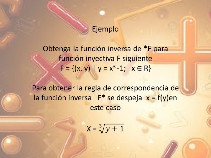 Para dar la interpretación simples a estas operaciones en el siguiente ejemplo se consideran ejemplo de pares ordenados finitos Obtenga F +G, F – G, FG F/G para las siguientes funciones F ={(-1, 3), (0, 5), (1, 7), (2, -3), (3, -1)} y G = {(0, -2), (-1, 6), (2, -4), (3, 0)} En este caso Df {-1, 0, 1, 2, 3} y Dg = {0, -1, 2, 3} y la intersección de ambos dominios es Df ∩ Dg = (0, 2, 3) Por lo tanto F+G = {(0, 5+ (-3)), (2, -3)+ (-4), (3 -1+0)} Eso es F+G = {(0, 3), (2, -7), (3, 1)