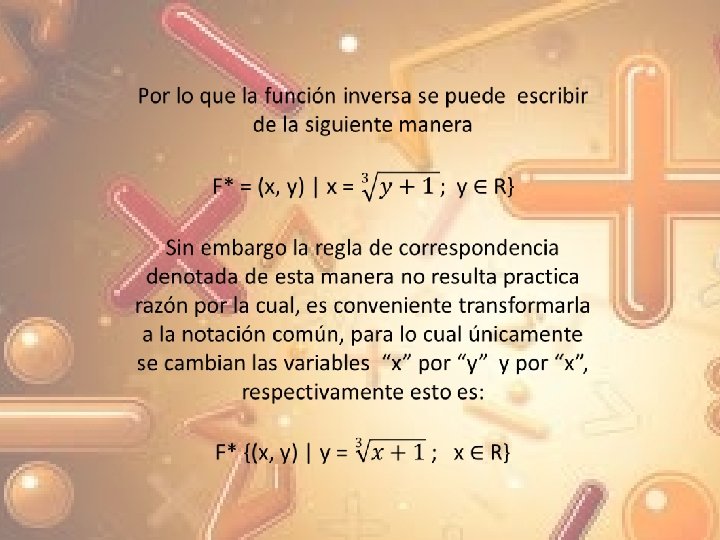 Una función real de variable real, también puede denotarse, en forma simplificada, por alguna de las siguientes maneras F, G, H, o bien f(x), g(x), h(x) o simplemente por “y” La restricción de que dos pares ordenados distintos no pueden tener el mismo primer número x, asegura que y, es único valor especifico de “x”