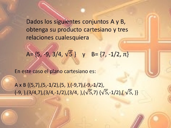 Producto cartesiano Dados los conjuntos A y B, el producto cartesiano de ellos, denotado por A x B, se define como el conjunto de todos los pares ordenados (a, b) donde a ∈ A y pertenece B, esto es; A x B = {(a, b) |a ∈ A ∧ b ∈ B} Relación: Es cualquier subconjunto del producto cartesiano A x B y se denota generalmente por la letra R.