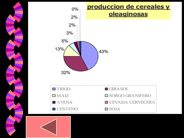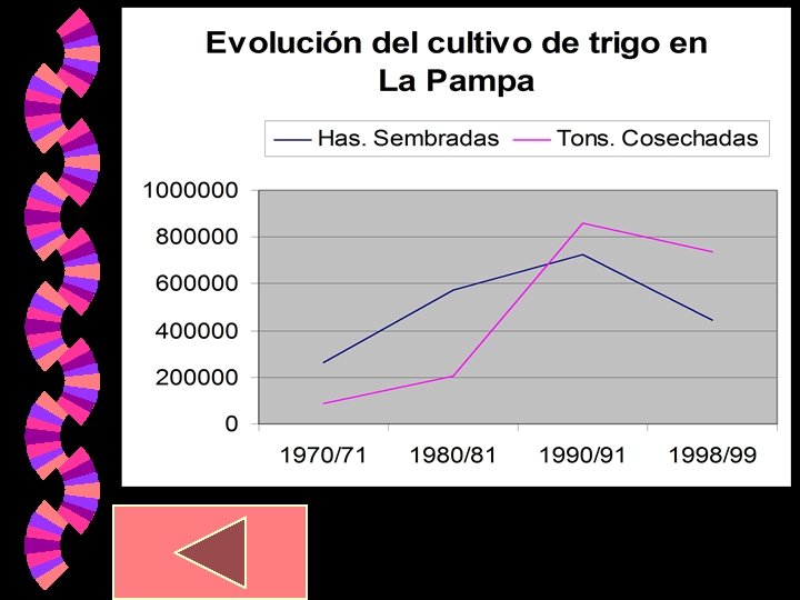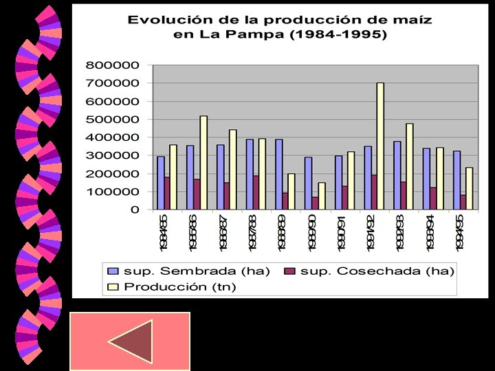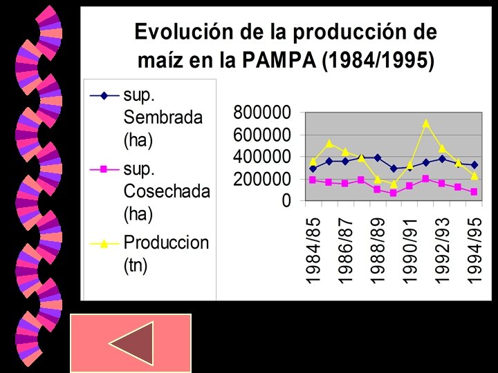 La producción de cereales en La Pampa * Gráficos: * Superficie bajo cultivo. * Producción de cereales y oleaginosas. * Sectores. * Barras. * Evolución de la producción de maíz en La Pampa (1984 -1995). * Líneas. * Columnas. * Evolución del cultivo de trigo en La Pampa. * Reflexiones. * Volver.