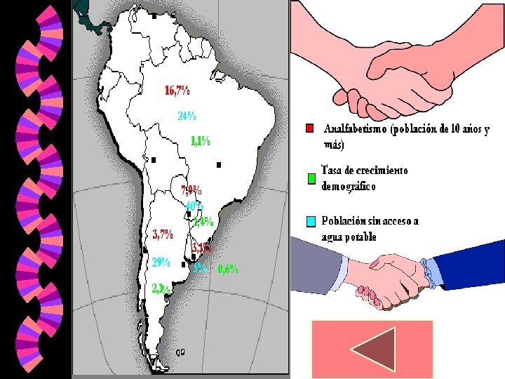 * Existe mucho analfabetismo en el norte (16. 7%) y sur de América del sur. * Existe poca población sin agua potable en el norte (24%), pero en el sur llego hasta el 40%. * La tasa de crecimiento demográfico llego en el norte al 1. 1% mientras que en el sur el máximo era 2. 4%.