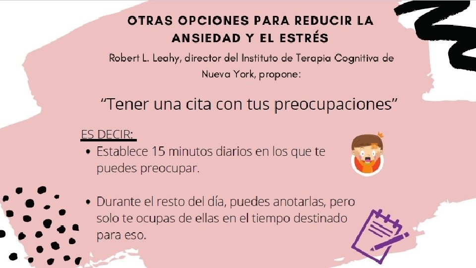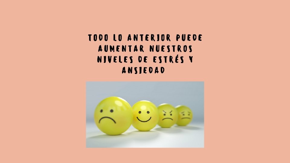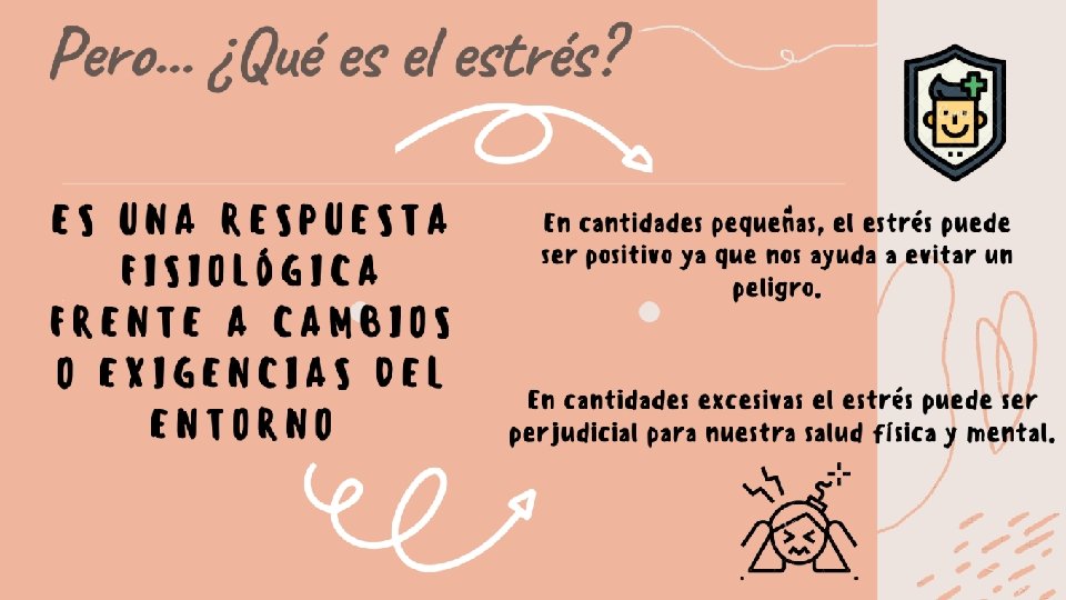 ¿Qué reacciones puedo tener si estoy bajo estrés? Emocionales • Ansiedad • Frustració n • Miedo • Culpa • Tristeza • Enojo • irritabili dad Físicas • Fatiga • Agotamiento • Dolores de cabeza • Sensación de ahogo y opresión • Mareos • Insomnio • Dolores musculares y gastrointesti nales. Conductuale s • Inquietud • Aislamiento • Evitación (Personas, situaciones y conflictos) • Dificultad para descansar • Cambios en la conducta alimentaria. Cognitivas • Confusión • Olvido • Dificultad para concentrar se • Dificultad para tomar decisiones