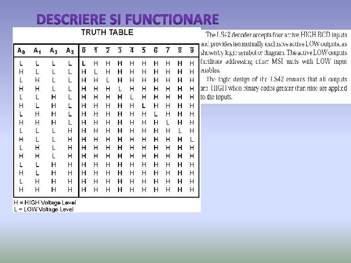 Circuitul integrat 74 LS 42 este un decodor binar zecimal, fiind realizat într o capsulă tip MP 117 prevăzută cu 16 terminale. ' La acest circuit, alimentarea se aplică la terminalul 8 ( Vc) şi termi nalul 16 (+ Vcc). Acest circuit realizează decodificarea din sistemul binar în sistemul zecimal, afişând maxim 10 stări ale unui numărător cu patru ieşiri în binar. . Stările codului binar sub formă de tensiuni de intrare se aplică circuitului 74 LS 42 la terminalele 15 (A) 14 (B) 13 (C) şi 12 (D). Ieşirile în sistemul zecimal se găsesc la terminalele 1 11 (înafară de 8). Traducerea din binar în zecimal se face prin apariţia stării 0 (tensiune zero) de la un terminal la altul, aceste stări culegîndu se poziţional. Exemplificînd, dacă la intrarea binară aplicăm starea 0011, în partea de ieşire zecimală vom găsi starea 0 numai la terminalul 4, la toate celelalte terminale existînd starea 1. Corespondenţa dintre stările ieșirilor în zecimal faţă de intrările în binar pentru circuitul 74 LS 42 este dată în tabelul din anexe corespunzător acestui circuit , Pentru restul stărilor de intrare binară, pînă la a 16 a, deoarece sunt 4 celule (24 = 16), ieşirile în zecimal rămân în starea 1. Un circuit conectat la unul din terminalele de ieşire zecimală este practic conectat la masă atunci cînd decodorul trece în starea 0. Această succesiune a trecerii prin zero a ieşirilor zecimale face ca circuitul integrat 74 LS 42, să fie comparat cu un comutator rotativ.