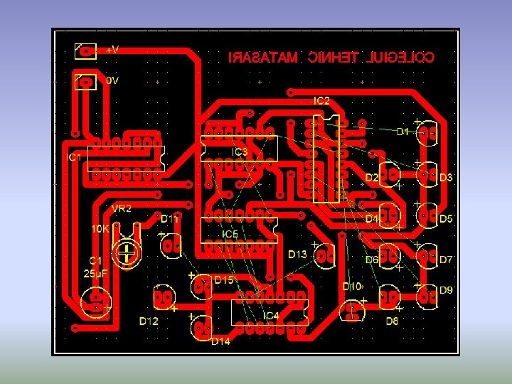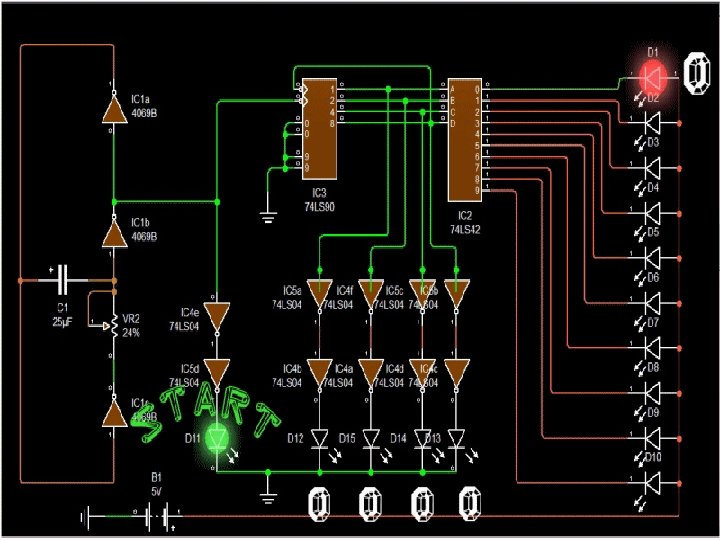 Alcătuirea schemei Schema cuprinde un "oscilator, de tact realizat cu circuitul integrat 74 LS 04, un numărător de impulsuri realizat cu circuitul integrat 74 LS 90 și un decodor binar zecimal realizat cu circuitul integrat 74 LS 42 (cu rol de comutator) La rândul său, circuitul integrat 74 LS 42 este comandat de către numă rătorul zecimal 74 LS 90, acesta asigurând prin ieşirile sale 8 9 11 12, o configuraţie în cod binar, care este aplicată intrărilor 12 13 14 15 ale 74 LS 42. Configuraţia de la ieşirea numărătorului zecimal are loc ca urmare a aplicării la intrarea 14 a unor aşa zise impulsuri de tact. Impulsurile de tact sunt obţinute de la un generator, realizat cu celelalte trei inversoare ale circuitului 74 LS 04, care împreună cu un potenţiometru (P) şi un capa citor (C) formează un oscilator capabil să asigure semnale electrice cu o frec venţă cuprinsă între 0, 2 Hz şi 5 Hz, funcţie de poziţia cursorului poten ţiometrului P. Consumul total de curent al schemei este de circa 128 m. A. Consumul de curent pe etaje este următorul: circuitul integrat inversor 74 LS 04 = 26 m. A; circuitul integrat 74 LS 42= 28 m. A; circuitul integrat 74 LS 90 = 24 m. A; Schema funcţionează continuu, în sensul că după baleierea celor zece LED uri procesul se reia după un interval cuprins între 0. 2 80 secunde.